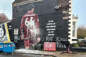 阿诺德在利物浦壁画今晨惨遭污损,涂鸦大字:“再见吧,老鼠”