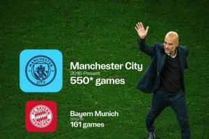 曼城官方晒瓜帅千场分布:曼城550场、拜仁161场、巴萨247场