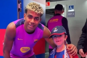 阿劳霍俯身问道:“我们去找亚马尔要球衣好吗?”随后他牵着小球迷的手走向更衣室,让小球迷与亚马尔见面。阿劳霍进入更衣室告知亚马尔这一情况,后者主动出来与小球迷合影,留下了温馨的一幕。