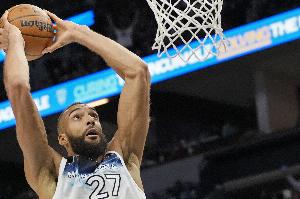 快下很积极!戈贝尔先是大踏步跟进双手暴扣 随后又快下轻松扣进