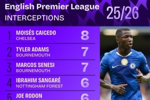 新赛季英超拦截榜:凯塞多8次居首,艾特-努里、查洛巴在列